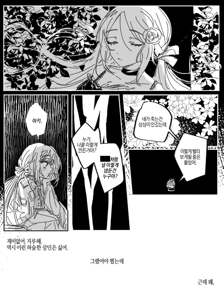 원하지 않은 배역을 받는 기분이란 이런 것일까 그는 생각했다. 그의 죽음을 보며 웃으며 즐거움을 느끼는 본인이 정말로 싫었다. 지금까지 수많은 사건들이 소설로 인해 일어났고 그것은 주목도가 높아지며 스스로 자살한 사건 또한 일어났다. 소설 쓰는 것을 그만둔 것도 그 이유. 자신의 소설이, 자신의 이야기가 누군가에게 그렇게 쓰이는 것이 싫어서.