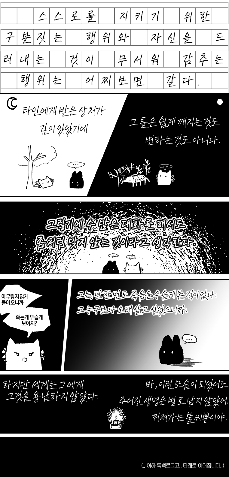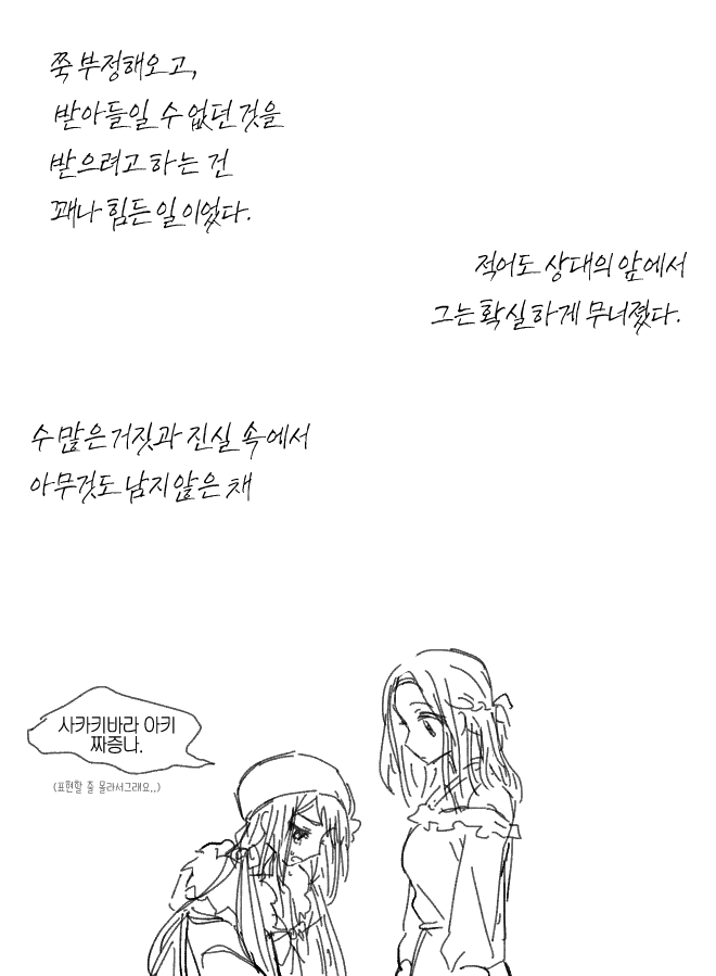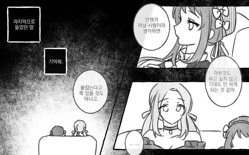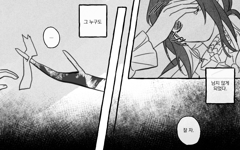 위태롭다. 그 말이 맞을지도 모른다. 지금 이 손을 놓게 되면, 눈앞에 상대를 놓게 되면 다시는 돌아갈 수 없을 것 같아서. 해결되지 못한 채 그대로 미궁으로 빠질 것 같아서. 상대의 의견은 처음부터 듣지 않았다. 결국 본인 멋대로 움직이고 생각할 뿐이었다.