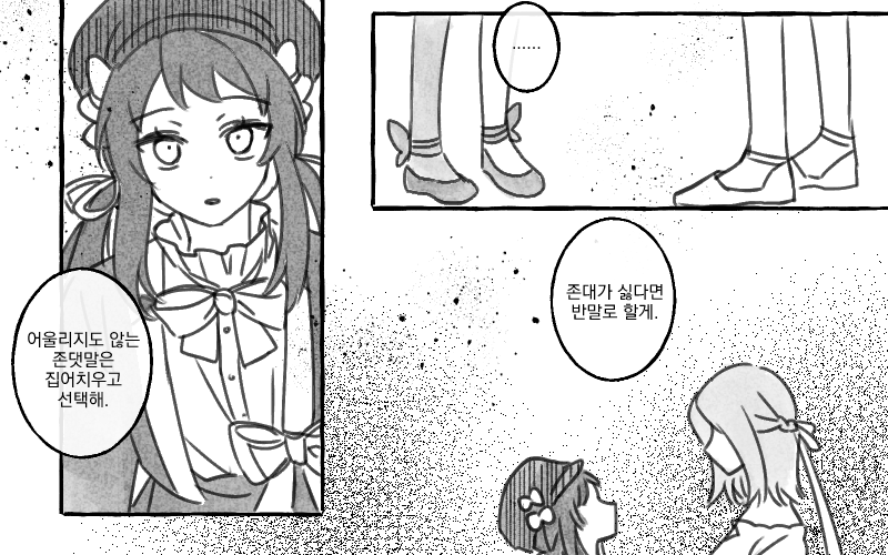 상대가 바라는 것이 그거라면, 그는 그저 들어줄 뿐이다. 자신이 이미 말했으니까. 그것을 지키지 않으면 무의미하지 않은가? 제대로 된 친구를 만들어 본 것은 처음이기에 상대가 알려준 정의를 제외하면 그도 사실 아무것도 모른다. 그렇기에 대답할 수 없다.
